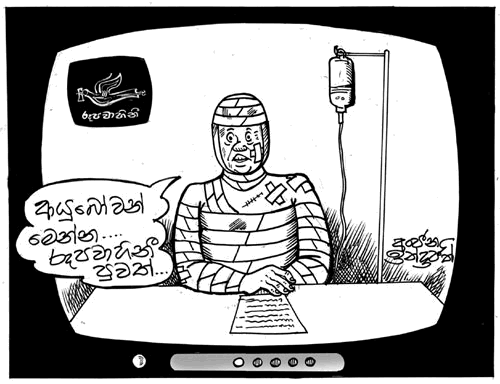 With so much attention to China’s response to Tibetan protesters and the recent repression in Myanmar, there seems to be a blind spot when it comes to the media intimidation story in Sri Lanka. Five workers at the state television station, Rupavahini, have been attacked as the cartoon depicts.