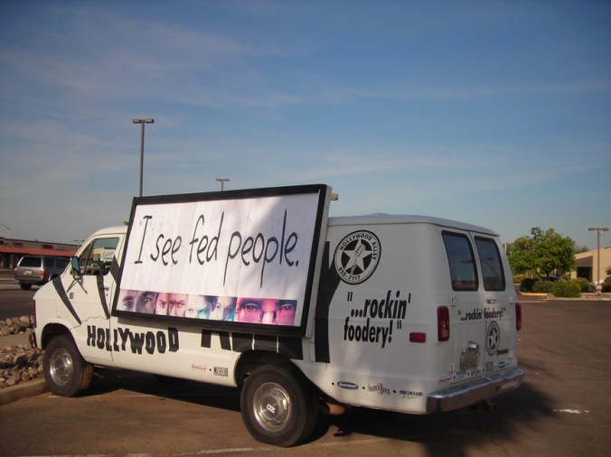 Hollywood Alley is a family-owned restaurant in Mesa, (NE corner of Baseline Road and 101)  For weeks I had noticed the signs were getting really creative –or at least intriguing. Yesterday I heard from John Wincek, who gave me the scoop about how a restaurant with “a kitschy style, and an off-kilter outlook on life-but other than that, we’re actually totally and completely normal!” created its own brand personality. He doesn’t use ad jargon like that, but that’s just what it is: DIY branding. No agency required.