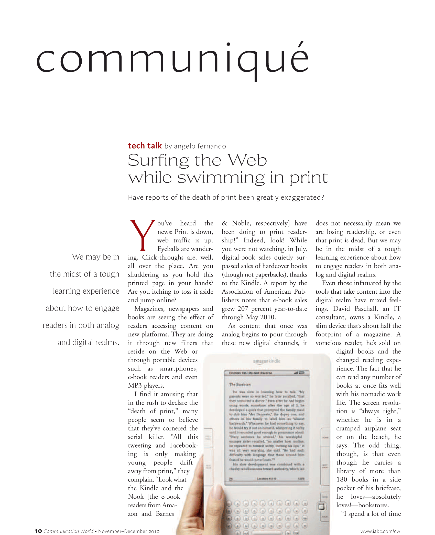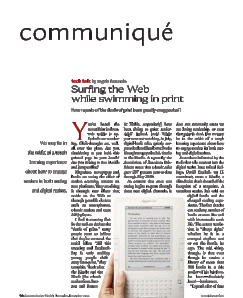 My recent column in CW (Communication World) magazine is the beginning of what has become an introspective view of where we are headed with all this digital content seeping out of every pore. I borrowed the headline from a campaign for the magazine industry that uses the word ‘swimming’ (in print) to compare it to what they suggest is a less engaging online experience of surfing.
