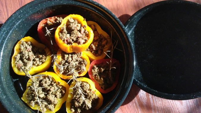 My wife has become quite an expert – and experimenter. This was the latest. Stuffed bell peppers, with rosemary. Previously it was roast beef. Before that egg plant, and spaghetti squash…