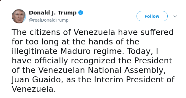 It was not too long ago (Jan 2019) that the Trump administration expressed its shock that the newly elected Juan Guaido in Venezuela was being blocked by incumbent president. In a flurry of tweets (what else?) President Trump threatened Nicolas Maduro, and telegraphed that troops, a naval blockade and embargoes were in the works. He tweeted that its citizens had suffered enough and Guaido would be recognized as the interim president of Venezuela by the US. The State Department too put out this statement. “The United States recognizes Juan Guaido as the new interim President of Venezuela, and strongly supports his courageous decision to assume that role pursuant to Article 233…”